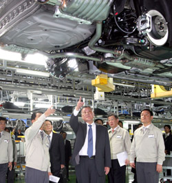 現代汽車總裁鄭夢九在視察現代汽車廠的生產車間