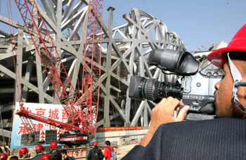 11月3日,參加中非合作論壇北京峰會報道的部分非洲記者來到2008年奧運會主會場國家體育場“鳥巢”工地參觀采訪。 這是一名非洲記者在“鳥巢”工地采訪拍攝。(新華社記者 汪永基 攝)
