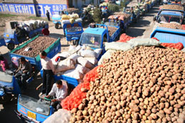 | 出售馬鈴薯的車隊排成長龍。本報記者