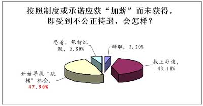那么,在職場打拼的白領對加薪的態度是怎樣的呢?對于企業加薪規則是否滿意呢?日前,國內權威的專業人才招聘網站之一中華英才網(ChinaHR.com)對此進行了調查。調查顯示,有接近一半的受訪者,比例為47.9%,在加薪上受到不公平待遇時,會“開始尋找跳槽機會”(如圖);而選擇正面與企業溝通的比例為43.1%,少于前者近五個百分點;有3.2%的受調者選擇了最極端的做法——辭職;能夠在這種情況下保持沉默的比例僅5.8%。(見圖)