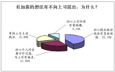 正如上面的數據反映的一樣,接受本次調查的公司職員中,從來沒有向上司提出過加薪要求的比例超過一半,為51.3%;而在曾經提出過加薪要求的受訪者中,僅有8.5%的職員得到了較好的效果,效果不好的比例為40.2%。