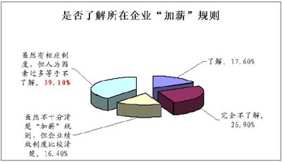 的確如人力資源專家擔心的那樣,受調查的職場白領對于所在企業的加薪規則了解的狀況不容樂觀;卮稹傲私狻钡氖茉L者的比例為17.6%,認為了解企業績效制度等同于了解加薪規則的比例為16.4%,兩者之和僅占總比例的1/3;而認為自己“完全不了解”的比例則為26.9%,尤其需要注意的是有高達39.1%的受調者對制度的執行表達了遺憾,他們選擇了“雖然有相應制度,但人為因素過多等于不了解”的態度。(見圖)