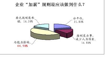 中華英才網人才研究中心專家指出,受調查的企業員工有近四成認為“人為因素過多”說明,企業在分配變動薪酬過程中往往由于分配薪酬的人存在著片面性、不公正性,而產生了許多矛盾,所以應當加強薪酬變動部分分配的監督機制,增強這類制度的透明度。他告訴記者:“一些優秀國外公司在這方面的實踐結果表明:與沒有員工參加的績效付酬制度相比,讓員工參與報酬制度的設計與管理常令人滿意且能長期有效。員工對報酬制度設計與管理更多的參與,無疑有助于一個更適合員工的需要和更符合實際的報酬制度的形成。在參與制度設計的過程中,針對報酬政策及目的進行溝通、促進管理者與員工之間的相互信任,這樣能使帶有缺陷的薪資系統變得更加有效!蹦敲,企業“加薪”規則最應該做到什么呢?如圖6所示,有44.9%認為首要的標準就是“與能力掛鉤”;其次有21.8%認為是公平性。(見圖)