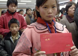 2006年12月7日,鄭州市一名小學生領到300元救助現金。 當天,鄭州慈善總會舉行鄭州市2006年“百千萬”慈善救助活動,幫助100名特困大學生、1000名特困中小學生及一萬名困難群眾。根據困難情況,慈善總會分別向他們發放了數額不等的現金及食油、大米、棉衣、棉被等過冬物品。 本報記者:岳月偉 攝(資料照片)