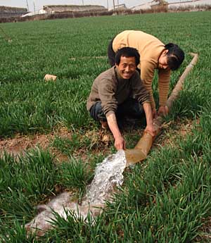 高青縣田鎮鎮姜家村村民在澆返青水。徐速繪