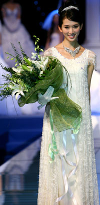 近日,在2007中國國際婚博會上,名模林志玲在某婚紗品牌發布會上亮相。盡管婚博會上的國際王牌婚紗令人驚艷,但更多的待婚族期待的是一場與眾不同的婚禮。本報記者:李明放