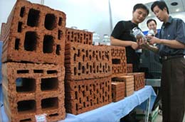 南京一家新型建筑材料公司在展示該公司利用頁巖和尾礦等礦山廢棄物開發研制的各種節能墻磚。(本報資料照片) |