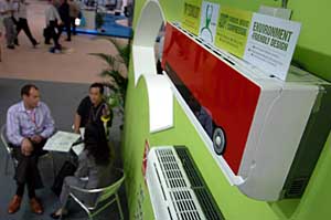4月19日,客商在廣交會出口展館一家中國家電企業的綠色環?照{展臺洽談。在4月15日開幕的第101屆廣交會上,中國家電企業推出一批綠色節能環保型家電產品,積極應對歐盟頒布的第三代綠色壁壘——“耗能產品環保設計”指令。新華社記者