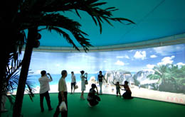 風光旖旎的海南吸引了越來越多的旅游地產投資者。圖為6月11日,在第四屆泛珠三角區域合作與發展論壇暨經貿洽談會上,一些觀展游客在海南省展廳內“天涯海角”巨幅照片前拍照。本報記者:趙眾志