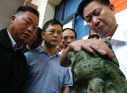青銅器鑒定專家張定福(右一)認真地為市民鑒定器物。 隨著民間收藏活動的升溫,一批考古與鑒定領域的專家學者們,利用周末免費為市民做文物鑒別與鑒定。 新華社記者:楊俊江