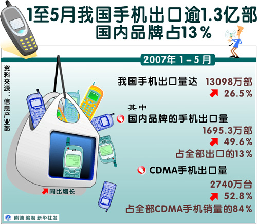 1至5月我國手機出口逾1.3億部國內品牌占13%