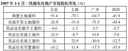 2007年第二季度,70個大中城市房屋銷售價格上漲6.3%,漲幅比一季度高0.7個百分點,4至6月各月房屋銷售價格指數逐月增加。其中,新建商品住房銷售價格同比上漲6.43%,漲幅比上季度高0.43個百分點;二手住宅銷售價格同比上漲6.9%,漲幅比上季度高1.7個百分點。深圳、北京、大連等城市的商品住宅和二手住宅銷售價格繼續保持較高漲幅。部分城市的住房價格高漲,源于該城市內房地產市場供不應求的矛盾持續加深,有些城市房地產市場的供給增長下降已經持續了兩至三年。以一線城市為例,從供給方面看,2007年1至6月,北京市、廣州市和深圳市房地產市場的供給指標中均有多項為負增長(見圖表)。不僅如此,如果拉長時序還可以看到:北京市房地產市場供給連續兩年負增長,深圳市房地產市場供給連續三年負增長。而從需求方面看,北京市、廣州市和深圳市房地產市場需求增長強勁,商品住宅空置率逐年下降,2007年上半年商品住宅空置面積則維持負增長。