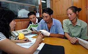 | 重慶首個農民工法律援助站受歡迎。8月17日上午,三名農民工在法律援助站向律師胡佳(左)進行咨詢。 新華社記者