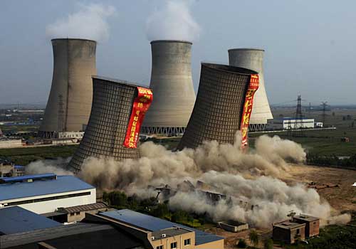 9月6日,河北邢臺翔泰熱電有限責任公司對總裝容量114MW的小火電部分設備成功進行爆破拆除,該公司的熱電機組已于7月23日全部關停。這是河北邢臺翔泰熱電有限責任公司爆破冷卻塔和動力通風塔的場景(9月6日攝)。