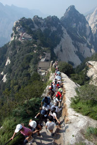游客在攀登華山險道飛魚嶺登山通道。新華社發 | 首屆中國體育旅游博覽會日前在上海閉幕。體育與旅游,都是熱門詞匯,兩者在北京奧運會的背景下結合在一起,更是吸引了海內外客商、新聞媒體和體育旅游愛好者的廣泛關注。 在國外,體育旅游已經擁有了比較成熟的市場,在北京奧運會來臨之際,中國體育旅游能否擁有一片燦爛天地?