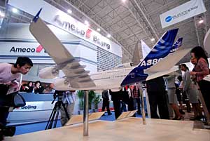 | 19日,參觀者在第十二屆北京國際航空展覽會上參觀空中客車A380模型。新華社記者 王建華