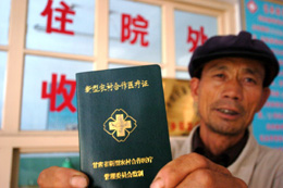 2007年,新型農村合作醫療制度已經覆蓋甘肅全省所有農村人口,參合人數達到1780萬人。圖為甘肅省白銀市平川區水泉鎮下村農民白江正在展示自家的“新型農村合作醫療證”。新華社記者:張錳