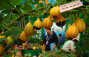 | 10月12日,在第五屆中國國際農產品交易會山東展廳上展出的特色農產品。新華社記者 徐速繪