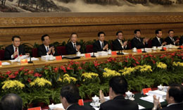 10月17日,中國共產黨第十七次全國代表大會主席團在北京人民大會堂舉行第二次會議。胡錦濤、吳邦國、溫家寶、賈慶林、曾慶紅、吳官正、李長春、羅干等出席會議。 新華社記者:蘭紅光