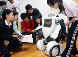 10月23日,由復旦大學師生自主研發的新一代智能機器人“復旦二號——復娃”正通過語音及自帶的視頻系統播放十七大現場視頻,吸引了同學們前來“聽講”。新華社記者:劉穎