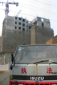 鄭州市行政執法局用車輛堵住“帝湖花園”施工現場入口,以防止其繼續進料施工。新華社記者:梁鵬