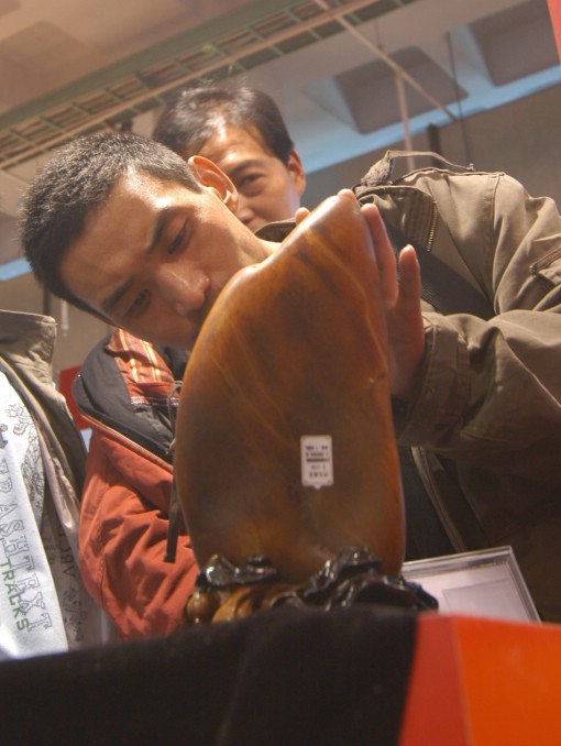 52公斤的和田玉羊脂玉籽料原石成為展會的焦點。該原石高60厘米,寬30厘米,玉質細膩,油潤度佳,沒有經過任何加工,是市面上罕見的重量級珍品。此外,展區一件重1.89公斤,高17厘米,寬16厘米的和田玉籽料觀音也頗受青睞。觀音支膝盤坐,右手握如意,左手撫膝,配花形飾,神態端莊,坐在潮音洞下靜心修煉。主體運用浮雕、鏤空、圓雕等多種雕刻技藝,色雅形美、疏密有致、線面結合,雕刻的十分生動而頗有神韻。同時一并展出的還有碧玉、青玉、墨玉等十多件原石。