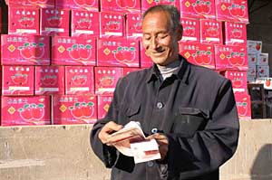 | 陜西洛川縣槐柏鎮度谷村果農清點領到的保險賠款。新華社記者 張軍