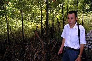 三峽珍稀植物園創建者向秀發在去年旱死的一片野生枸杞樹前痛心不已。這個植物園自2002年建設以來,就因體制不順、無主管部門而缺乏資金來源。今年6月,已負債30萬元的向秀發無力支撐,被迫關閉植物園,園內珍稀植物面臨各種災害威脅。本報記者