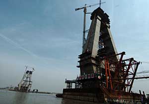 | 建設中的武漢天興洲長江公鐵兩用橋。本報記者 程敏