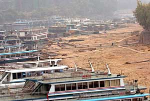 | 桂林陽朔碼頭上?康囊蚶旖幌陆当黄葧簳r停航的游船。新華社記者 陳瑞華