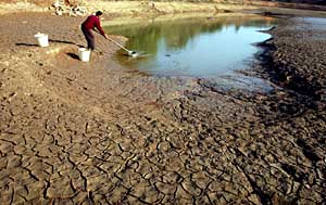 | 12月1日,江西省鷹潭市童家鎮的一位農民在一座幾近干枯的水庫中取水。新華社發 胡南