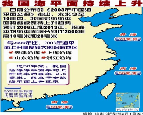 國家海洋局發展戰略研究所高級工程師鄭淑英告訴記者,近50年來,我國沿海海平面以每年2.5毫米的速率上升,高于全球海平面上升速率的40%。 “2006年,我國沿海海平面比常年平均海平面高71毫米,預計2016年,我國沿海海平面將比2006年上升31毫米!编嵤缬⒄f,海平面上升將直接引發風暴潮災發生的頻率增大,災害強度加大,同時加重海水倒灌、海岸侵蝕等災害影響,直接導致沿岸陸地被淹、海島面積縮小。