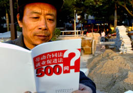 1月1日,來自四川渠縣的外來工肖光明在福州街頭工作休息時閱讀勞動合同法的相關問答。當日,《中華人民共和國勞動合同法》正式施行。