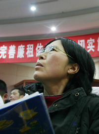新年新居新期盼。 前不久,江西省九江市中心城區2007年度第三批經濟適用住房暨廉租房公開搖號在該市圖書館舉行。在市監察局兩名監督員的監督下和兩名公證人員的全程公證下,直接搖號產生1059個中簽家庭和對應房號。圖為一位市民在期盼著自己搖中經濟適用房號碼。新華社記者:章武