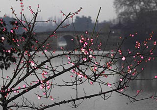 | 西湖風景區內的盛開的紅梅吸引了眾多游客前去觀賞。新華社記者 徐昱