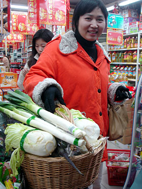 | 蘇州一家大型超市推出了環保藤編籃。顧客只要交10元錢押金,就可以將購買的商品用藤編籃帶回家。顧客可憑證退回押金。新華社發