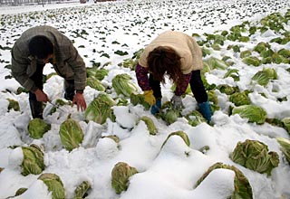 | “蔬菜之鄉”湖北省嘉魚縣組織菜農及時采摘蔬菜,向武漢、廣東等大城市配送,保證市民雪后的蔬菜供應。新華社記者 余國慶