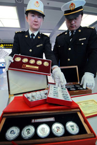 近日,沈陽海關在沈陽桃仙國際機場空港口岸連續查獲兩起涉嫌侵犯北京奧運會奧林匹克知識產權案件,共查獲涉嫌侵權的鑰匙鏈120個、紀念幣22套和若干紀念郵票等物品。圖為海關工作人員在清理查獲的涉嫌侵犯北京奧運會奧林匹克知識產權的物品。
