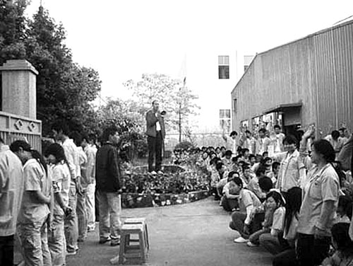 張全收拿著喇叭正發動員工投票選舉農民工主管 |