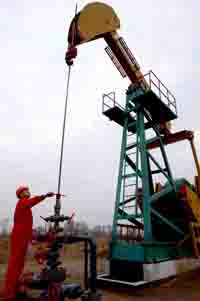 大慶油田第六采油廠的技術人員對抽油機進行巡檢。新華社記者:陳建力