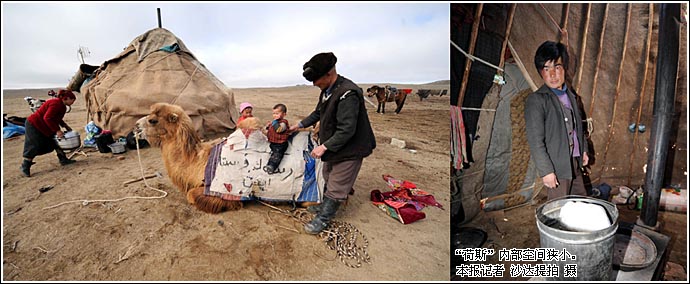 風沙四起,哥哥留下的痕跡頃刻無影無蹤。說起當年的那次迷路,別列提克至今后怕不已:風沙與黑夜無邊無際,自己一個人在沙丘后面躲了7個小時、也哭了7個小時!耙皇歉绺缁貋碚,我肯定死了! 大風來的時候,羊們會順著風走,只有用鞭子不斷敲打,才能讓它們穩住陣腳!帮L沙天,羊走出去50米,你就休想再把它找回來”,別列提克說。 有一年在阿克達拉冬牧場,本村的達吾列提拜和他的羊群都被大風吹走了。后來,人被救了回來,300只羊,一夜之間全沒了。 游牧中的女人最是辛苦。白天要洗衣做飯帶孩子,夜里要看管羊群。一般每兩個小時要走出氈房看一次,大聲吆喝驅趕野獸,一夜下來只能睡5個小時。遇到刮風下雨天,便整夜不能安睡。 逐水草而居的生活讓牧民落下許多病。最常見的是關節炎和心腦血管疾病。前者是因為風吹日曬,后者,是因為人們一路上難得吃到蔬菜,吃肉食太多的緣故。 哈薩克語“荷斯”,指牧民在轉場路上暫住一兩天時,所搭起的簡易氈房。它比普通的氈房小很多,勉強可容兩人起居。 在富蘊縣庫爾特鄉的遼闊戈壁灘上,我們走進了哈孜孜別克家的“荷斯”。 “荷斯”低矮,人在里面直不起腰來。地上鋪了一塊小毯子,那是哈孜孜別克的“床”,旁邊還長著稀稀拉拉的幾株草。一只瘸腿的貓,睡眼惺忪地躺在燒著羊糞的鐵爐邊,看見生人也懶得起身。只有那只拴在外面的牧羊犬,自始至終咆哮不已。 哈孜孜別克說,他們已經從冬牧場走出來20多天了,還有兩天才能到接羔點。4月份羊羔生下來,長到一個月大,就要跟著羊群一起往下走,直到夏牧場。 人在旅途,比風雪更讓人難以忍受的,是孤獨。從3月起,45歲的漢子哈孜孜別克,將獨自帶領羊群,在準噶爾盆地西南緣與中蒙邊境之間往返一次,走完826公里的全程。每晚陪他解悶的,只有一臺磨掉了漆的收音機。 在青河縣我們又找到了一家“荷斯”,它坐落在一個三面小山環抱的避風處,距離最近的公路3公里。 “荷斯”的主人、19歲的木拉提,熱情地將我們讓進“荷斯”坐下,邀請喝奶茶。他用一個手提鐵皮桶燒水喝,里面裝的大雪塊尚未化開。 木拉提說,“荷斯”周圍沒有水源,他每天要騎摩托車到三公里以外的地方,裝上兩桶還沒有融化的雪回來,燒水喝。 每半個月左右,木拉提就會騎摩托車到就近的集市買些青菜和土豆回來!耙灿袏蕵,那就是在附近放牧的年輕人隔幾天到一起,打打牌! 以木拉提的人生經歷,他想像不出城里年輕人怎樣娛樂,無法想像和互聯網、電影院、KTV關聯的生活。 據說,許多像木拉提這樣獨自放牧的哈薩克人,久而久之,會養成了自說自話的習慣。因為在放牧的時候,他們和牛說話、和羊說話,和沒有生命的任何東西說話…… |