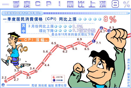 受國際市場價格持續大幅上漲,生產成本逐步走高以及低溫雨雪冰凍災害等多重因素影響,一季度廣東省居民消費價格指數創出近11年單季新高,全省CPI累計上漲7.6%,其中1-3月分別上漲6.6%、8.7%和7.6%。與全國相比,一季度廣東省CPI低于全國平均水平0.4個百分點。