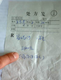 4月22日,執法人員展示一份銷售“易瑞沙”藥品的處方箋,上面顯示一瓶銷售2500元。新華社記者:鞏志宏