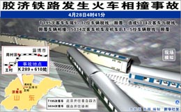 28日凌晨4時48分,北京至青島的T195次下行到膠濟線周村至王村區間時,客車尾部第9節至第17節車廂脫軌,與上行的煙臺至徐州的5034次旅客列車相撞,致使機車和五節車廂脫軌,造成重大人員傷亡。到晚間發稿時為止,已死亡70人,傷416人。其中有4名法國旅客受傷! 記者在現場看到,從北京至青島的T195次列車有8節車廂傾覆到鐵路一旁。與其發生碰撞的5034次從煙臺至徐州的火車,至少有4節車廂脫軌。 淄博中心醫院副主任醫師徐東譚14時在現場接受記者采訪時說,他從早6時就來到現場,負責將傷員分派到各家醫院。已有110多名傷員經他的手被分派往多家醫院救治。他說,傷員多是面部受傷、受撞擊骨折等。 據初步調查顯示,這是一起人為責任事故。鐵道部已作出決定,免除濟南鐵路局黨政主要負責人的職務,接受審查,聽候處理。 據了解,膠濟線周村至王村區間限速為每小時80公里。北京至青島的T195次下行通過時達到每小時131公里。事故詳細原因正在調查中。