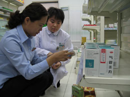 國家食品藥品監管局規定,自今年5月1日起,我國奧運賽事承辦城市藥店需擺放與興奮劑相關的警示標語;未標注“運動員慎用”字樣的含興奮劑藥品停止銷售。5月1日北京藥監系統全員出動開展興奮劑類藥品經營專項整治行動。圖為北京市藥監局海淀分局的檢查人員在檢查藥品及說明書。