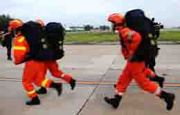 5月12日,中國國家地震災害緊急救援隊隊員在北京南苑機場集結。 當日,中國地震局新聞發言人張宏衛通報,針對四川汶川地震,中國地震局已啟動一級預案,一支180人的救援隊已經集結。新華社記者:王建華