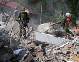 5月19日,成都軍區防化團官兵在地震中變成一片廢墟的北川中學噴灑消毒藥劑。新華社記者:陳樹根