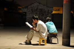 5月20日,什邡縣城的兩位高三學生在避震棚邊的路燈下復習。新華社記者:姜帆
