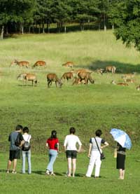 昔日地廣人稀、寒冷原始的“北大荒”,如今隨著各類天然而充滿特色的旅游項目開發,正在成為中國新的旅游勝地。圖為游客們在伊春市一個天然鹿場觀賞鹿群。 |