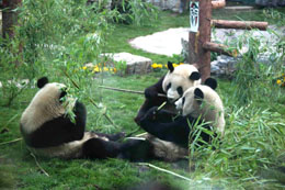 6點15分,剛剛進入陌生新家的八只奧運熊貓寶寶開始大吃竹葉,一點也沒有“認生”的感覺,好像就在臥龍家鄉一樣。記者看到,最能吃的是“福娃”,它竟然撇開了嬉戲打鬧的兄弟姐妹獨自抱著竹子大嚼大啃,一點兒也不在意玻璃幕墻外記者們頻頻閃爍的閃光燈。